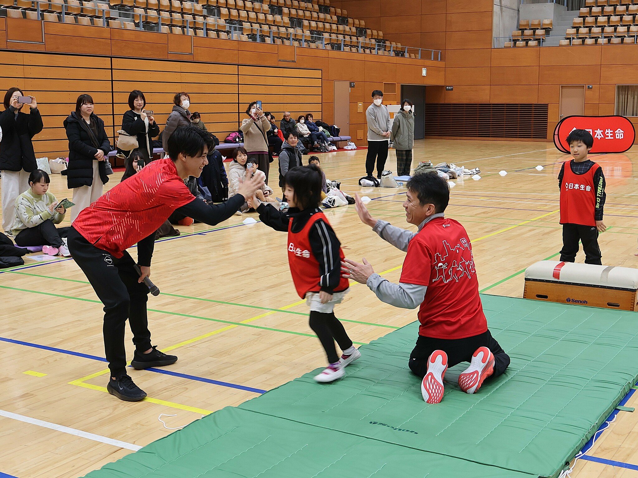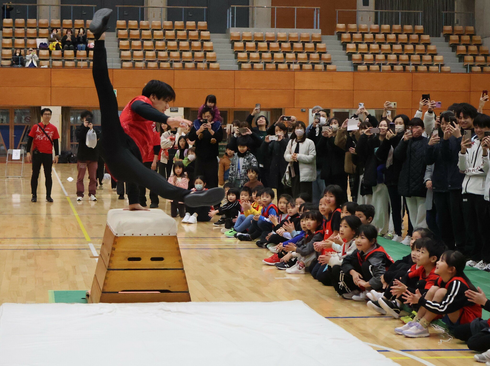 橋本選手は前転、側転などのマット運動や跳び箱を指導。跳び箱では、足を開いて強く跳ぶことや、できるだけ遠い位置に手をつくことなどをアドバイスした。跳び箱を使ったあん馬の実演も行い、会場を沸かせた。教室後にはトークショーがあった。