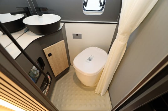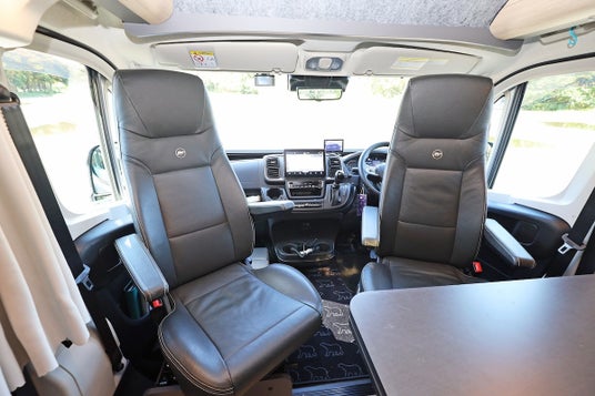 「回転式フロントシート、広いトイレルーム、処理の手間がないクレサナの装備、そしてリヤの常設ベッド。どれも夫婦旅にちょうど良いサイズ感です。」