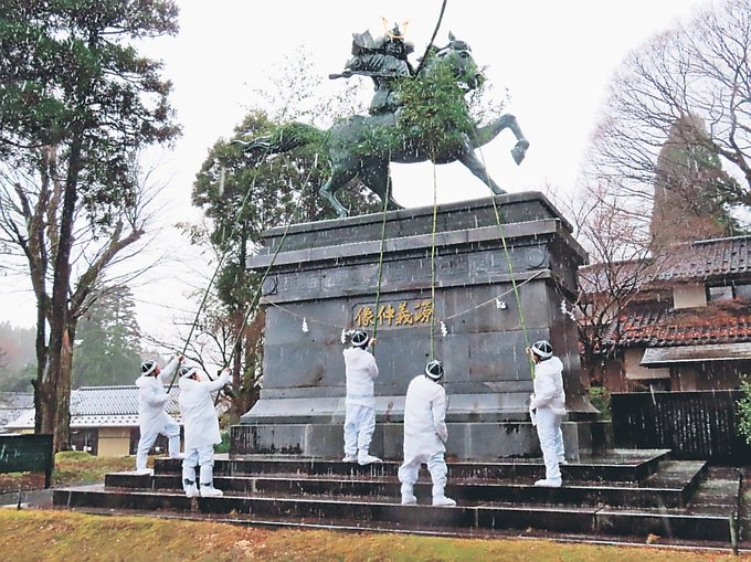 平安末期の武将・木曽義仲ゆかりの埴生護国八幡宮(富山県小矢部市埴生)で、境内にある義仲像の「おきよめ」が行われ、地元の青年団が一年間の汚れを落とした。