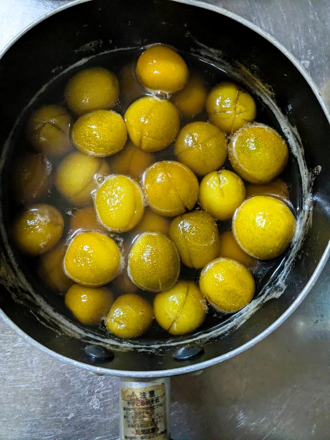 ②金柑と、その3分の2の量の水を小鍋に入れ、10分ほど煮込みます。アクが出たら取り除きます。