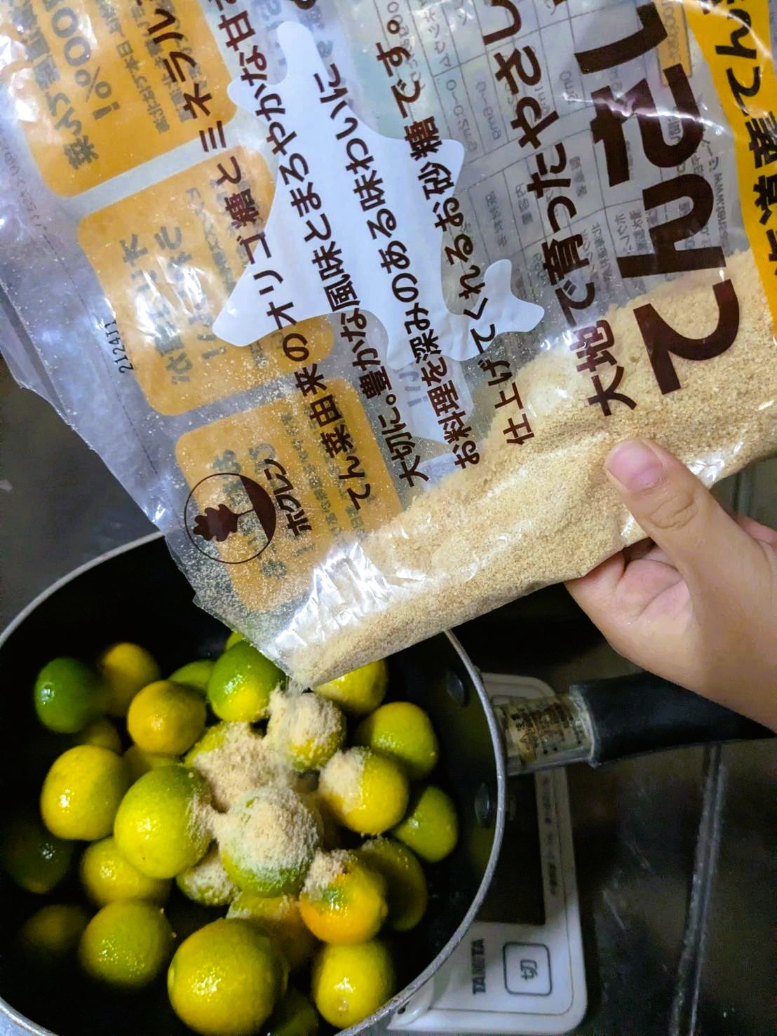 ③煮込んだあと、金柑の半量ほどのお砂糖を入れて5分ほど煮込みます。お好みではちみつを追加しても良いです。