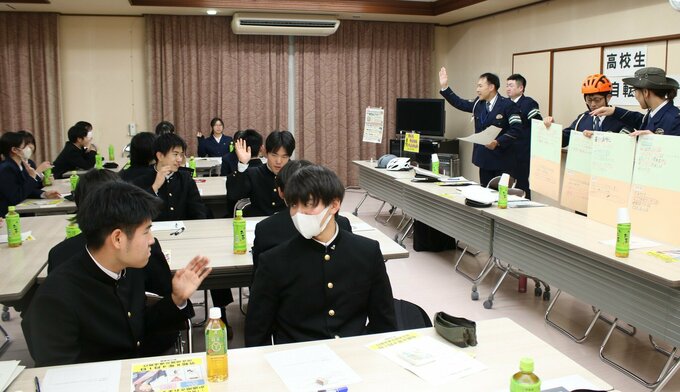 県警交通企画課と魚津署が開き、サイクル安全リーダーの1、2年生22人が参加。県内での交通事故の発生状況や来春から始まる自転車の交通反則通告制度(青切符)について説明を受けた後、4班に分かれて討論した。