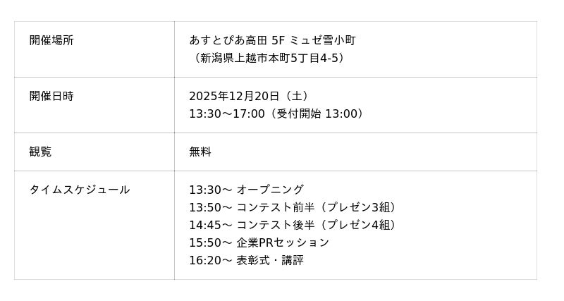 本イベントでは、上越市の多様な業種の企業6社が抱える「リアルな経営課題」や「新事業構想」に対し、大学生や若手起業家たちがチームを組み、数ヶ月にわたり練り上げた事業プランをプレゼンテーションします。