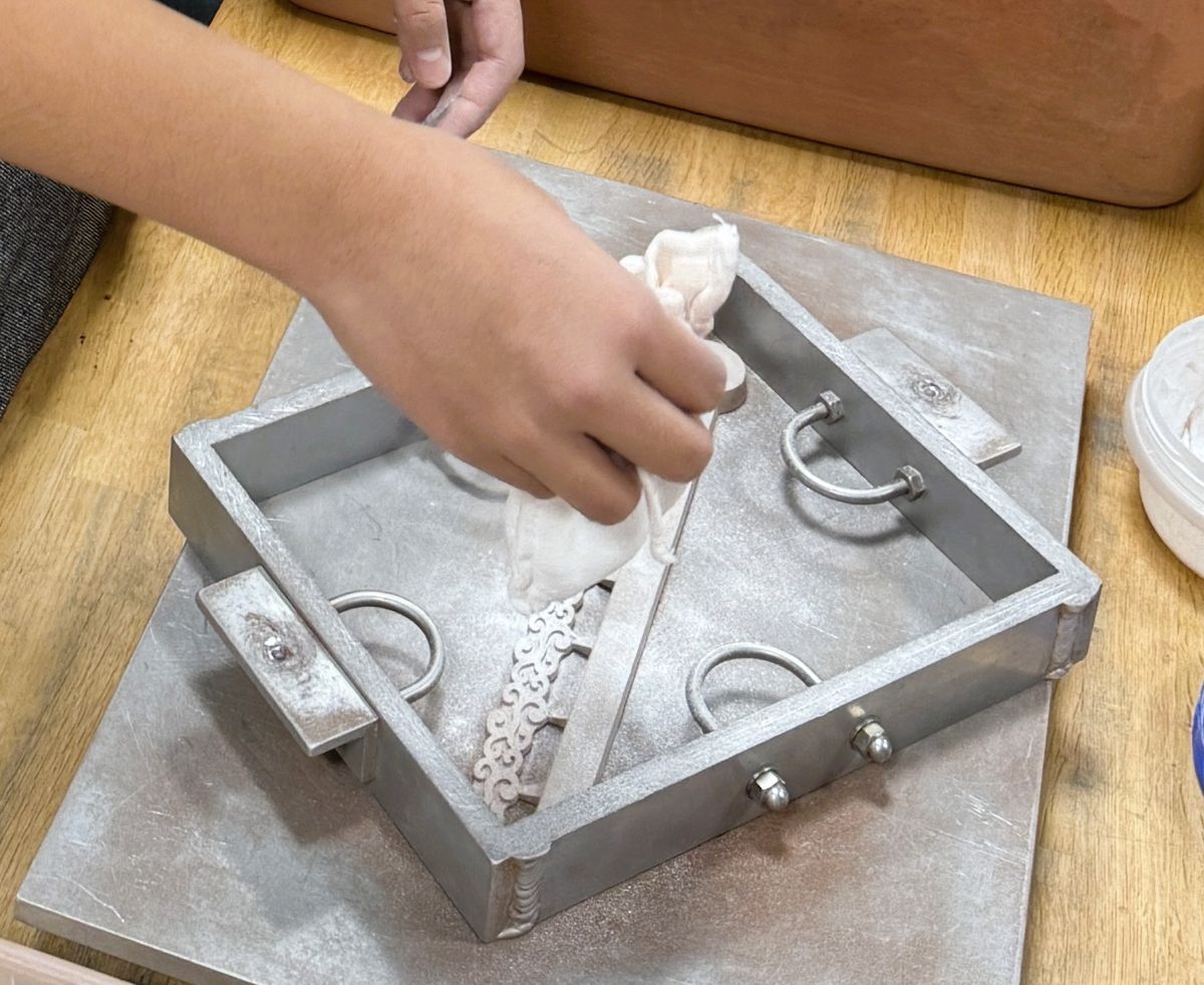 錫が固まってから取り出すと、少しは模様が残っていたので、一安心。ほっとする間もなく、ノコギリで切ったあとの、いわゆるバリをヤスリで削ります。スプーンで光沢を出すように、こすったりもしました。