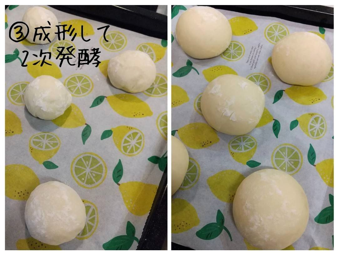 ③ 成形して2次発酵。家に居たのでオーブンレンジの発酵機能を使って35度に保ち、2倍ほどに膨らむのを待ちます。この日は3時間くらいかかりました。