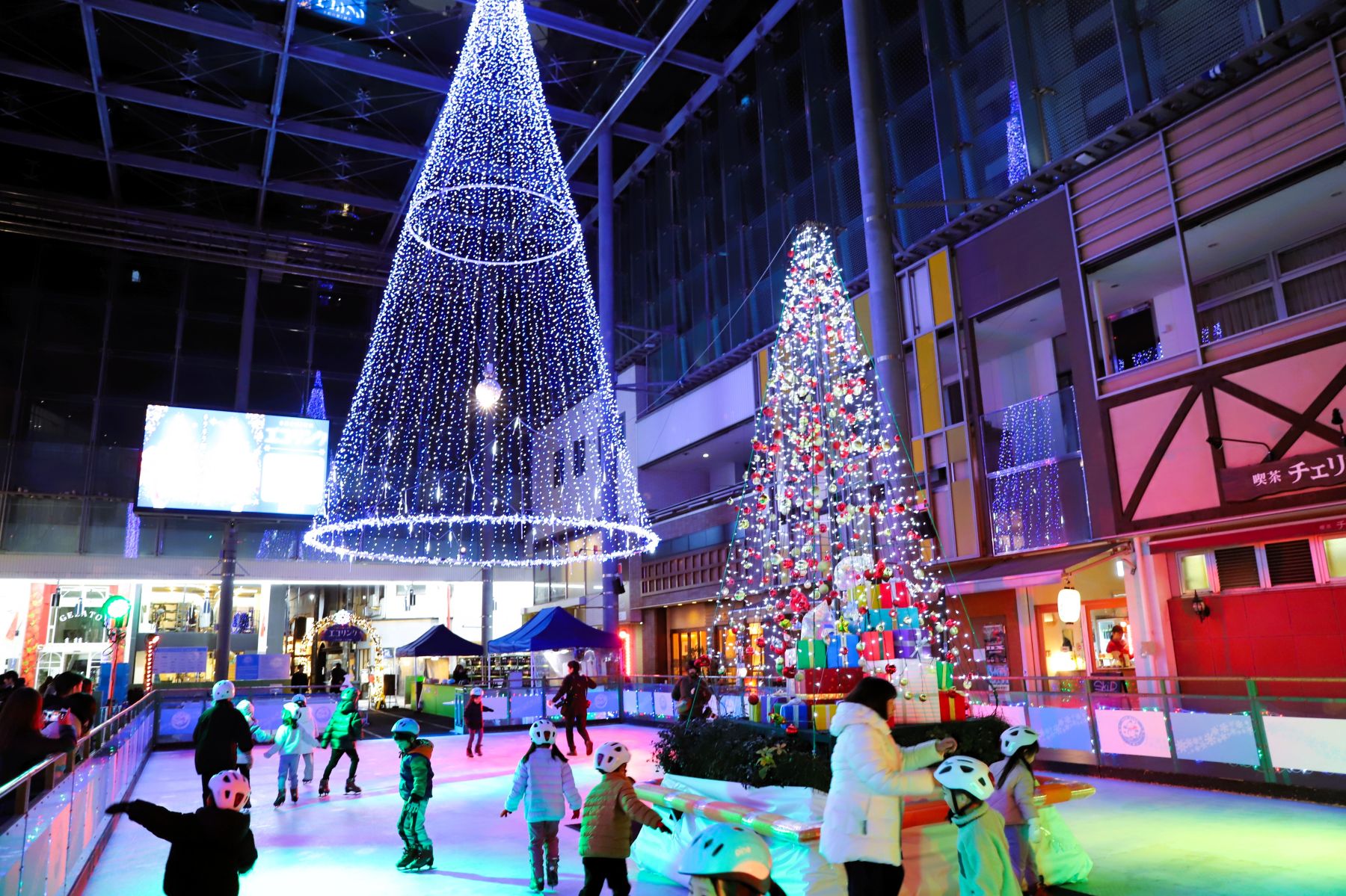 氷の代わりに特殊な樹脂パネルを使用した「エコリンク」で、気軽にスケートを楽しもう!今年は巨大な『空中ツリー』が復活。リンク中央のイルミネーションツリーとともに、輝く“ダブルツリー”が夜のリンクを幻想的に照らします。