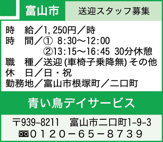 PR 【12月21日掲載】青い鳥デイサービス【2025】 12月21日掲載開始分 2025年12月21日 05:00 パート この求人は電話でのみ応募を受け付けております 0120-65-8739 この機能は会員限定です。 お気に入りの記事を保存し、マイページで読むことができます。 ログイン 会員登録はこちら