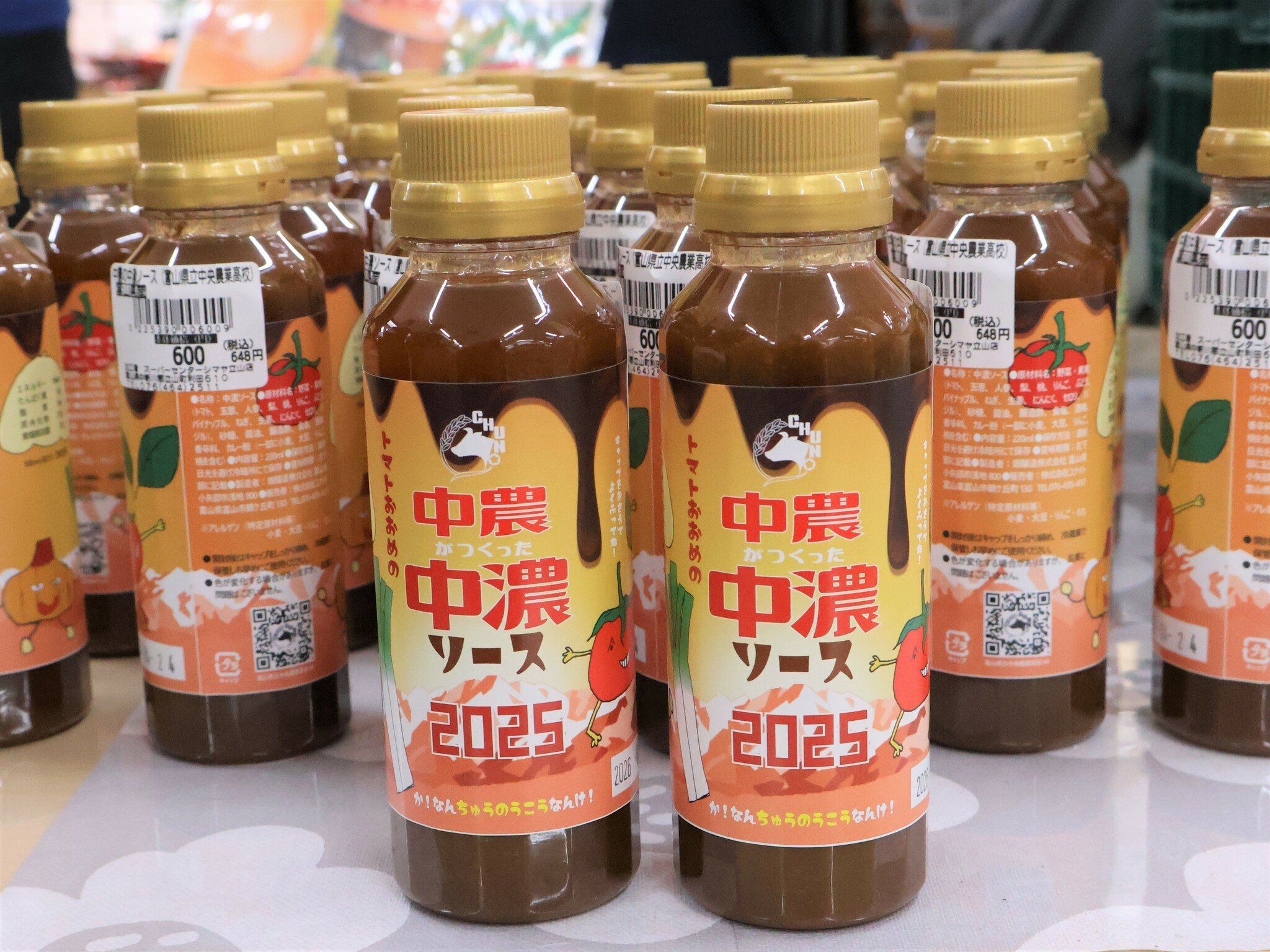 富山県の中央農業高校の生物生産科作物科学コース野菜専攻の生徒3人が19日、スーパーセンターシマヤ立山店(富山県立山町利田)で、県内企業と協力して開発した「中農がつくった中濃ソース」の販売実習を行った。