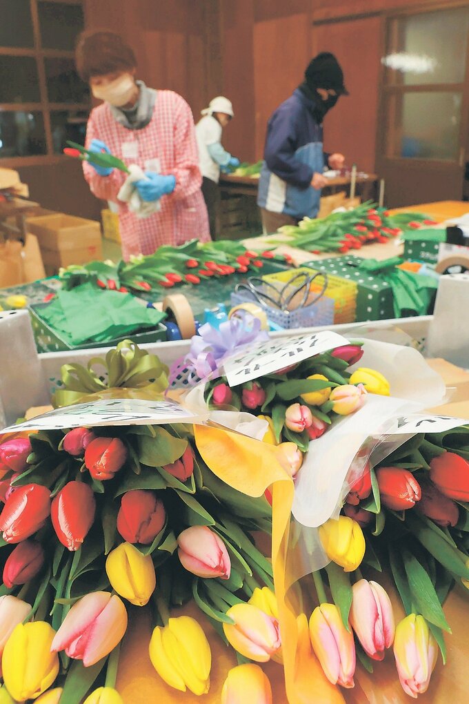 クリスマスや正月の贈り物として人気があるチューリップ切り花の出荷が、富山県砺波市三郎丸の農産物生産販売会社「フルール」で進んでいる。19日も従業員が一足早い春を感じてもらおうと、カラフルな花束を仕上げた。