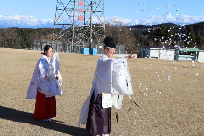 祈願祭では高瀬神社(南砺市)の藤井宮司がおはらいし、スキー場を運営する五谷観光企業組合の山本建一代表理事や夏野修市長らが玉串をささげた。山本代表理事はあいさつで検索大賞に触れ、「多くの家族連れに楽しんでほしい」と話した。