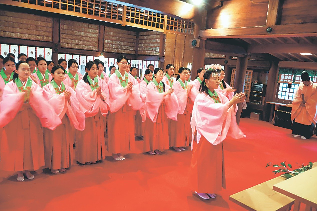 講習も行われ、栂野宮司が「日本のこれからの100年が平和であるよう願って、参拝者に福を授けてほしい」とあいさつ。その後、心構えや奉仕内容について説明があった。福ひめは31日から1月12日ごろまで務める。