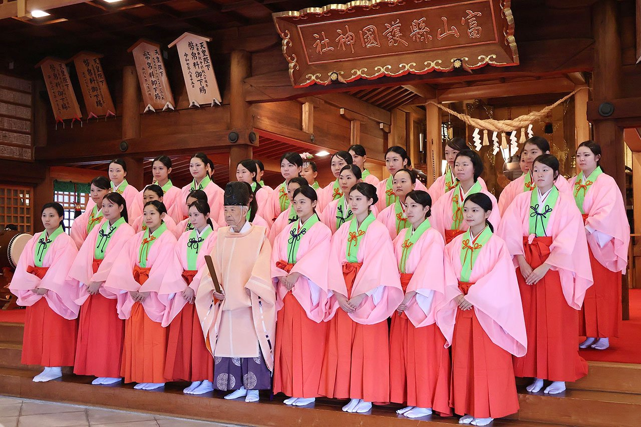 県護国神社は21日、富山市磯部町の同神社で、正月巫女(みこ)「福ひめ」の認証式を行い、桃色の衣装「千早(ちはや)」を着た県内の高校生、大学生ら計38人を福ひめに任命した。