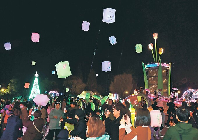 富山県砺波市で開催中の「チューリップ公園KIRAKIRAミッション2025」で21日、スカイランタンを揚げるイベントがあり、時折小雨が降る中、大勢の来場者がランタンとイルミネーションの光の共演を楽しんだ。