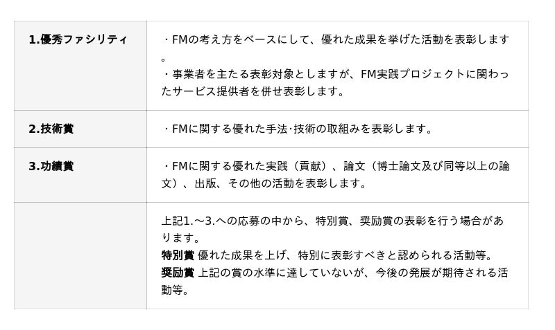 日本ファシリティマネジメント大賞(JFMA賞) 表彰の区分
