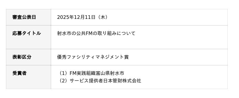 日本管財ホールディングス(本社:東京都中央区、代表取締役社長:福田 慎太郎、以下「当社」)は、グループ会社である日本管財株式会社が、公共施設包括管理事業を通じて富山県射水市のJFMA賞「優秀ファシリティマネジメント大賞」受賞に寄与し、サービス提供者として表彰されたことをお知らせします。