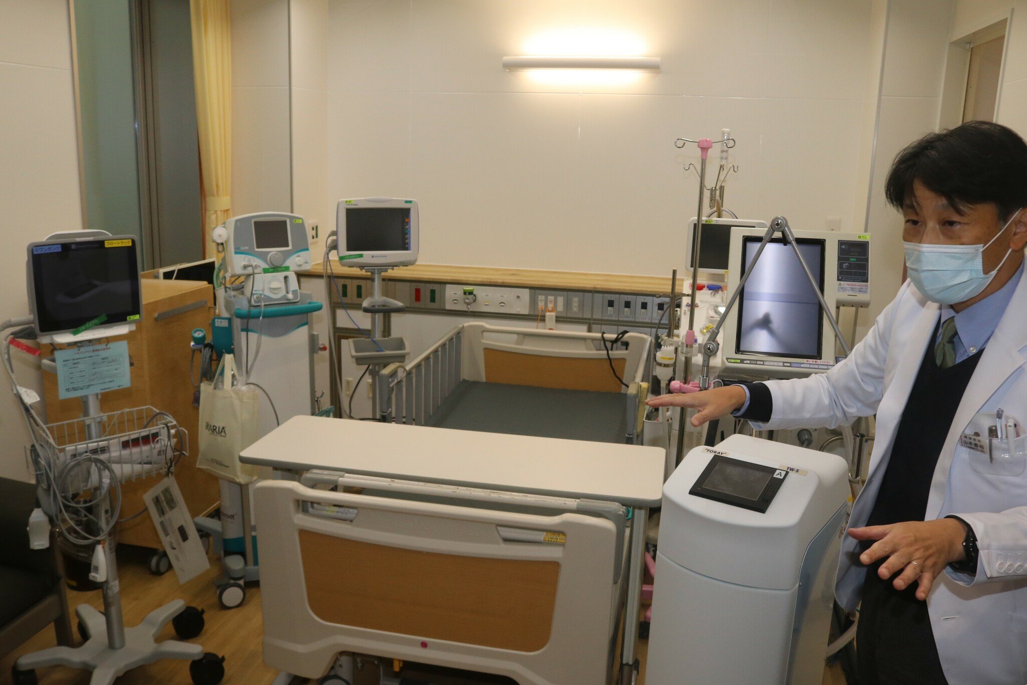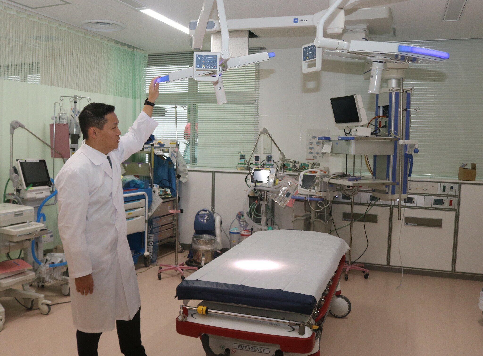 人工呼吸や人工透析などの処置ができ、複数の扉が同時に開かないようにするシステムや、足で扉を開閉するスイッチも付けた。救急車から患者を直接収容できる動線を確保している。整備費は1億8千万円。
