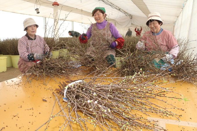 この日は組合員が枝の長さを約80センチに切りそろえ、5本程度に束ねて袋詰めした。暖かい場所に置いて花を咲かせて涼しい場所で管理すると、約1カ月は花が持つという。