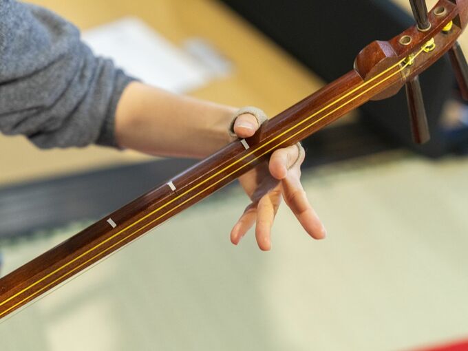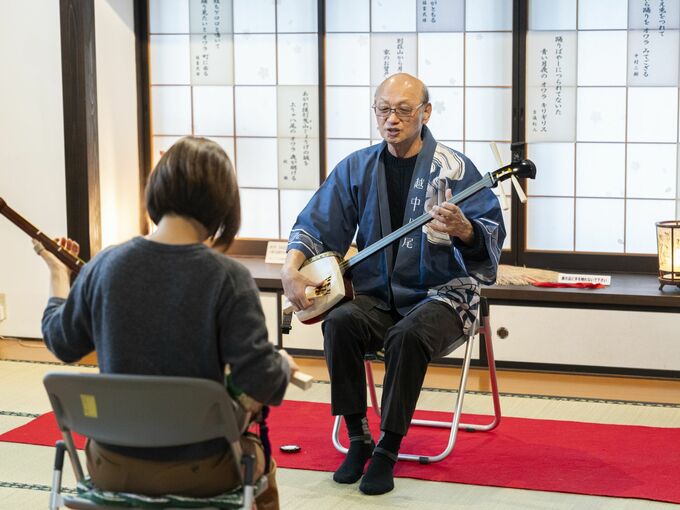 「おわら風の盆」の街として、毎年9月に多くの観光客が集まる富山市八尾地域。おわらの魅力の一端に触れようと、「富山市八尾おわら資料館」を訪れた。資料や映像を通じておわらを紹介するほか、三味線体験教室を行っている。講師は地元の東町自治会長の新井弘さん。「気軽に楽しんでください。楽器を体験すると、おわらの見方も変わりますよ」と笑顔で話してくれた。三味線の構造や構え方を教わり、左手の弦を押さえる場所を示してもらいながら、一つずつおわら節の音を弾いていく。最初はぺん、ぺんと響きのない音だが、何度も繰り返すうちにちょっと張りのある音になってきた。「その調子! 歌と合わせてみましょう」と新井さん。町家を再現した空間に情緒たっぷりの歌声が響く。一緒に弾いていると、優雅な雰囲気が存分に味わえた。