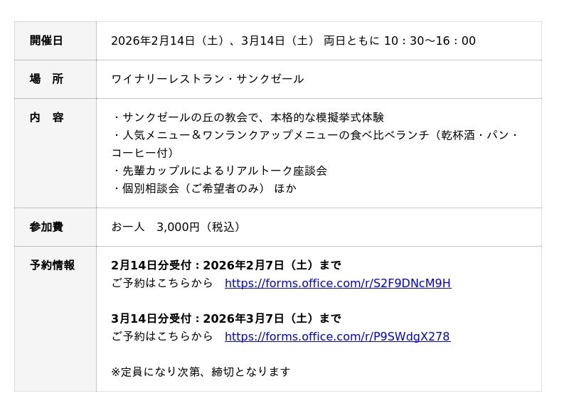 「久世福商店」、「St.Cousair(サンクゼール)」などの専門店を全国に約180店舗展開している、食品製造小売企業(食品SPA)の株式会社サンクゼール(本社:長野県飯綱町/代表取締役社長:久世良太)は、2026年2月と3月、サンクゼールの丘(長野県飯綱町)にてブライダルフェアを開催いたします。
