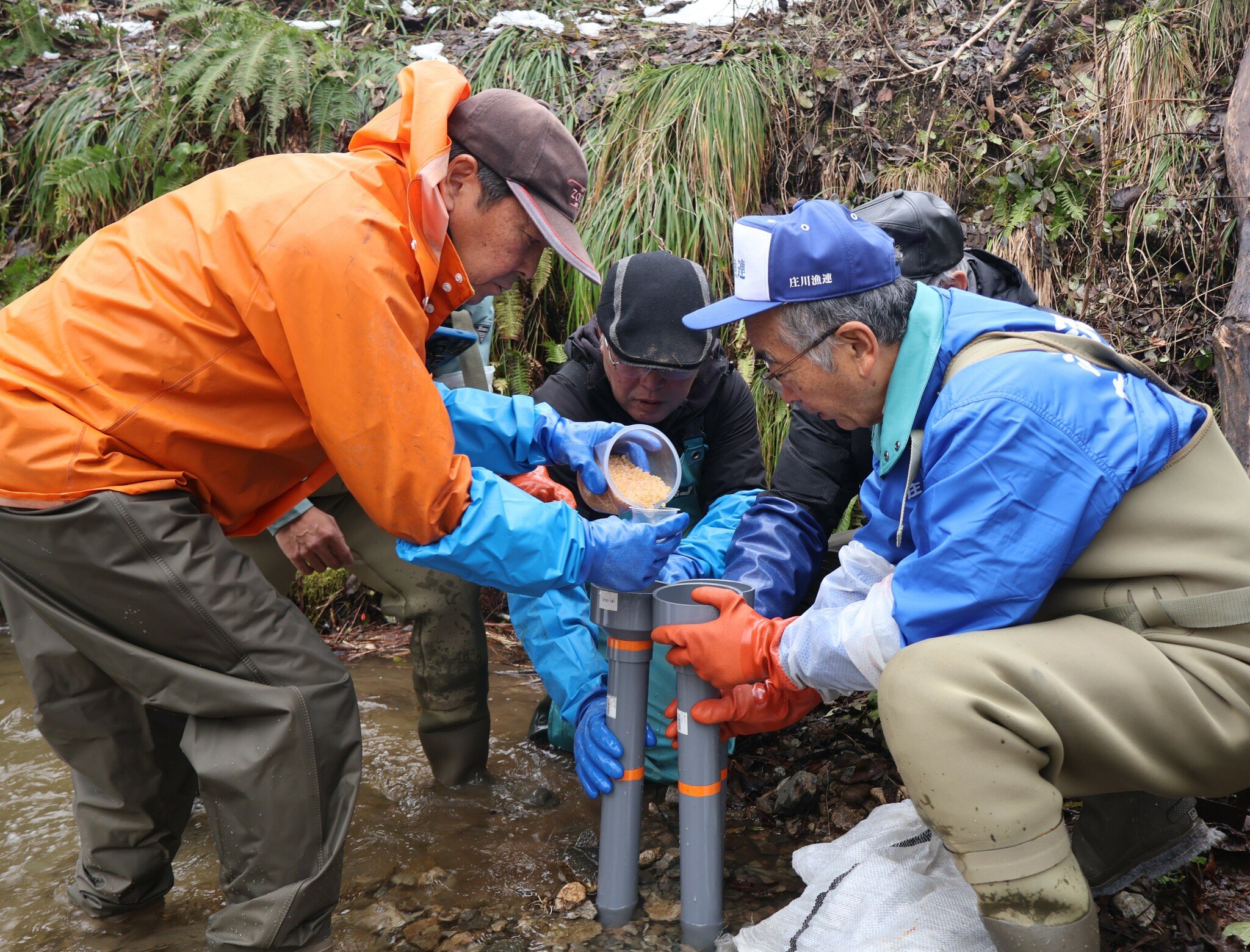 この日は7人が養殖した発眼卵2万5千個を、管を使って川底に埋め込み、砂利をかぶせた。2カ所で放流し、条件の違いなどを今後データとして比較する。