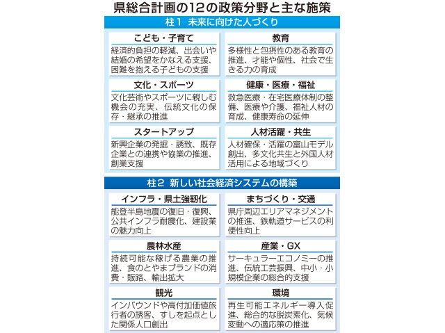 知事が24年秋の知事選で公約に掲げた「未来に向けた人づくり」と「新しい社会経済システムの構築」を政策の柱とし、子育てや教育の充実、幅広い人材の活躍支援、インフラ整備などを推し進める。それぞれの施策で成果目標を設定し、県民への聞き取りを基に設定した10年後の富山の理想像「とやま2035」の実現につなげる。