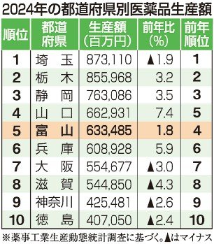 富山県内の2024年の医薬品生産額は前年比1・8%増の6334億8500万円で、2年連続で増加した。不適切製造による生産量低下から回復基調となっている上、大手メーカーからの受託生産が増えたことも後押ししたとみられる。ただ、都道府県別の順位は一つ下がり5位。金額の伸び率も全国の数字を下回っており、関係者は「バイオ医薬品など高付加価値製品への挑戦が必要」としている。
