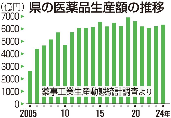 県内では近年、製薬企業の不適切製造が相次いで発覚。日医工(富山市)は21年、廣貫堂(同)は22年に県から業務停止命令を受けた。各社は品質管理体制を見直した上で製造を再開。生産量は徐々に回復しており、24年の生産額は21年以降で最高となった。需要の拡大によって供給不足が続くジェネリック医薬品(後発薬)の大手メーカーなどからの受託も増えた。