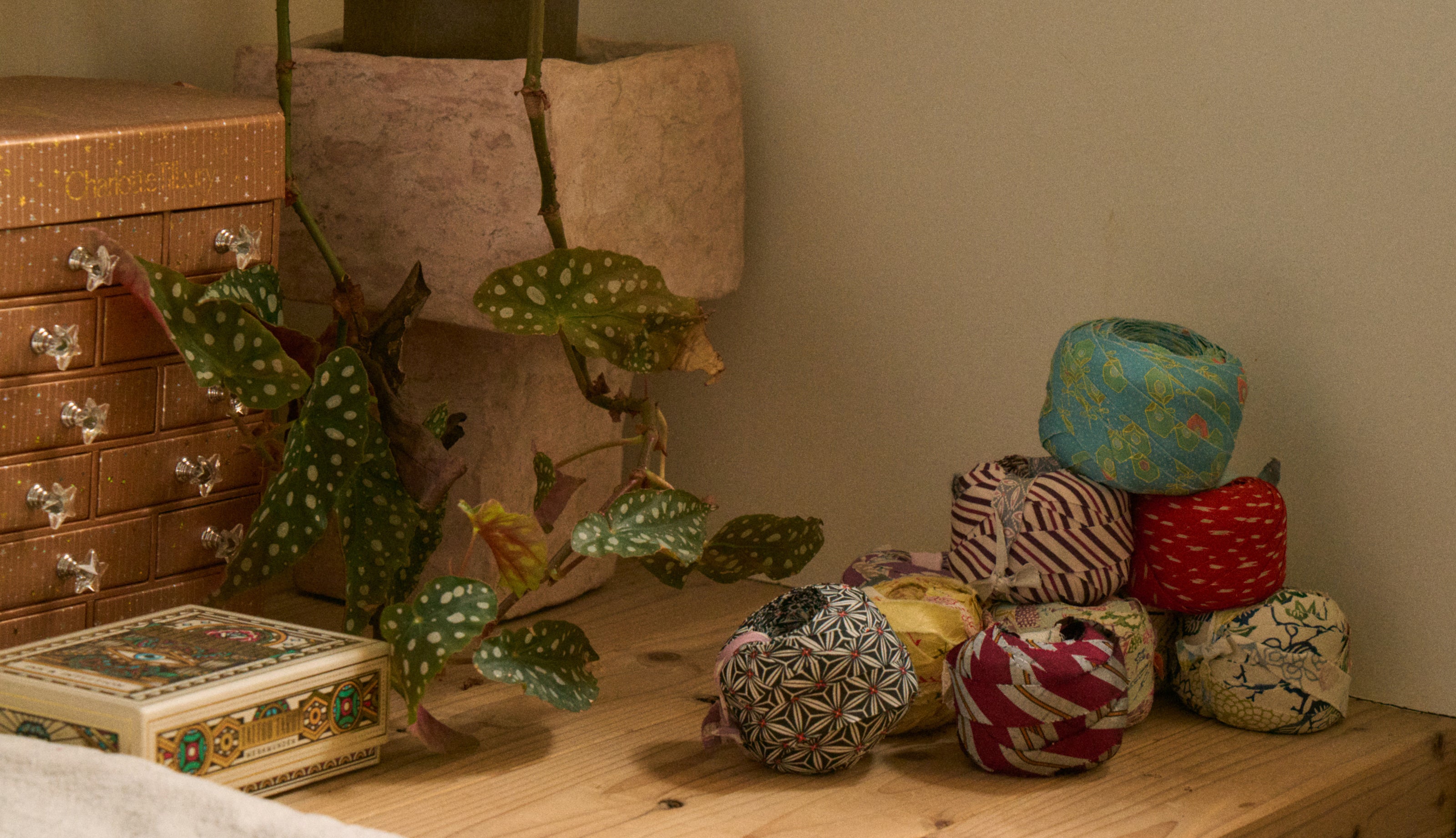 キモノヤーンとは、着物を原料としたアップサイクル手芸糸です。制作はほぼすべての工程を手作業で行い、元の着物が持つ質感や色合いをできる限りそのまま生かしながら、一本の糸に仕立てています。原料となる着物によって柄や風合いが異なるため、そのすべてが一点物となります。