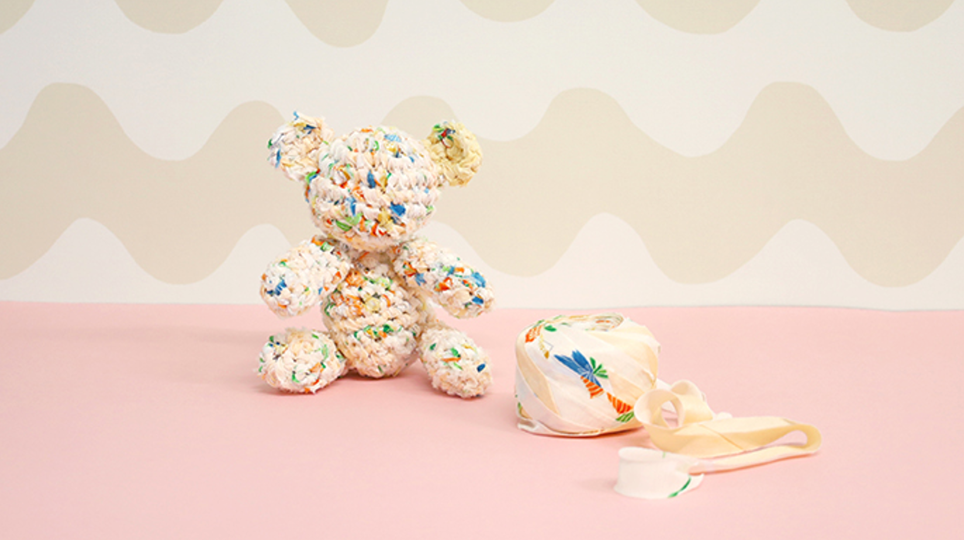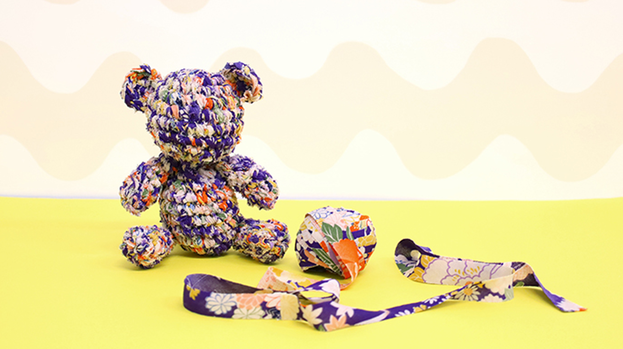 既存のキモノヤーンを使用するキットでは、長さ30mのキモノヤーンと、あみぐるみ用の綿と編み図(動画付き)をセットにしてお届けします。キモノヤーンはそれぞれが1点もののため、どのような表情のクマに仕上がるかは、完成してからのお楽しみとなります。