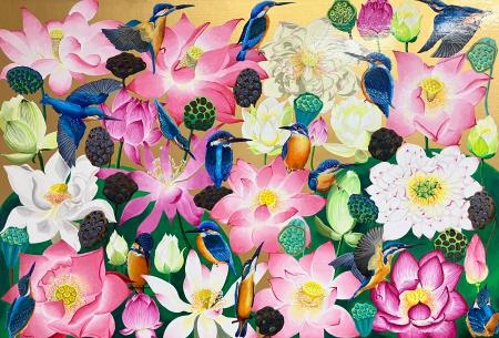 精神的困難を抱える京都の大場多知子さんが華やかな色で描いた「蓮と翡翠」は、花々の力強さが見る人を引きつける。パリのポンピドーセンターに作品が所蔵されている埼玉の知的障害者、斎藤裕一さんの抽象画も。ボールペンで幾重にも重ね書きされ、大好きな地元サッカーチーム「浦和レッズ」のロゴをほうふつさせる赤色などが印象的だ。