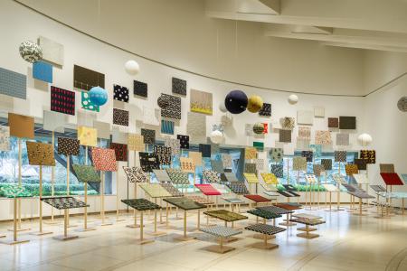 会場には、30年の歩みを物語るテキスタイルとものづくりの背景を多数展示。中でも約180のテキスタイルが壁面を埋め尽くし、緩やかに共鳴し合うインスタレーション「chorus(コーラス)」は必見だ。「bird」「flower」「geometry(幾何学)」といったカテゴリーに分け、一つのデザインが次のアイデアへと進化し、受け継がれる様子を表現した。