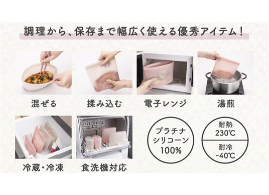 耐熱・耐冷性に優れた100%プラチナシリコーン製で、調理から保存まで幅広く使えます。くり返し使えるので環境にやさしいだけでなく、経済的な商品となっています。シリコーンバッグの中で調理から保存までこれ一つでできます。洗い物を減らし、タイパもコスパも良い商品です。