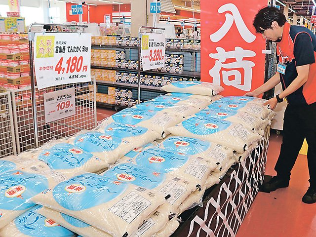昨年夏から続く米価高騰は、今年になっても落ち着かなかった。8月下旬、県内のスーパーに並んだ県産米わせ品種「てんたかく」の新米の価格は5キロ4500円超で、昨年同期から約1・6倍に上がった。