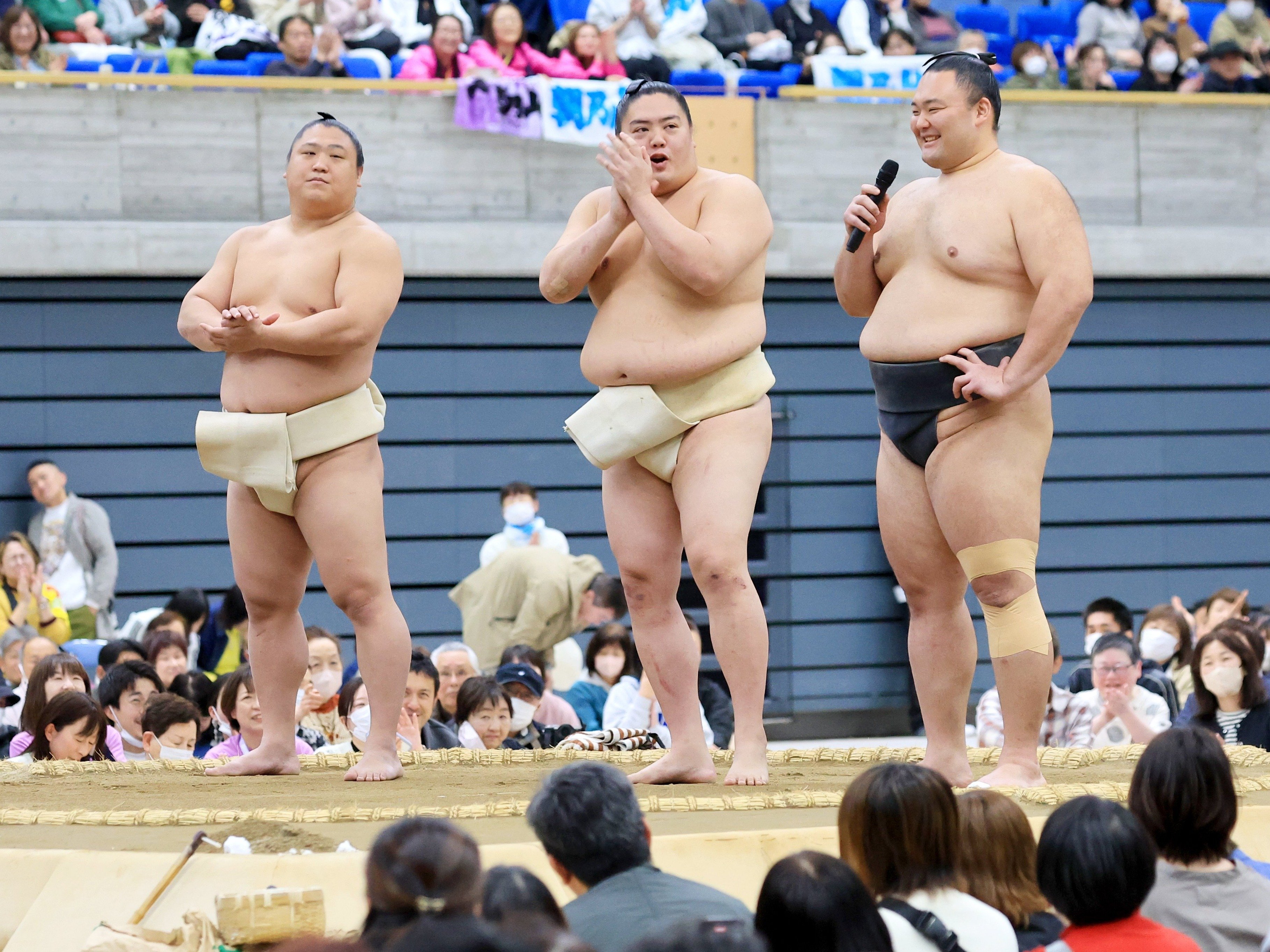大相撲春巡業富山場所で、トークショーに出演し笑顔を見せる(右から)朝乃山、一山本、若隆景=2025年4月6日、富山市総合体育館