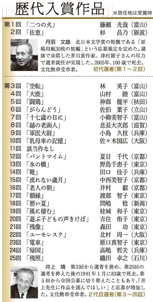 北日本文学賞が60回を迎えた。地方から個性豊かな作家を発掘しようと、初代選者に丹羽文雄さんを招き、賞を創設したのは1966年。第3回から井上靖さん、第26回以降は富山ゆかりの宮本輝さんと、文壇を代表する作家の単独選で人気を集め、累計の応募数は4万4000編を超えた。規定は原稿用紙30枚。作品が映し出すのは、人間の普遍的な営みや時代の空気だ。「読み終えた後、奥底から何か大きなものが湧き上がってくる」。35年にわたり選考を担う宮本さんは、そんな小説との出合いを楽しみにしているという。(室利枝、田中智大)
