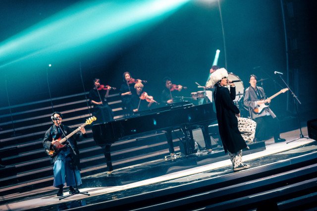 ボーカルの野田洋次郎は白いフワフワの帽子をかぶって登場。NHK連続テレビ小説『あんぱん』の主題歌「賜物」をハンドマイクで軽やかに歌唱し、ストリングスが入ったゴージャスなバンドサウンドで魅了した。サビでは『あんぱん』の名シーンも映し出された。