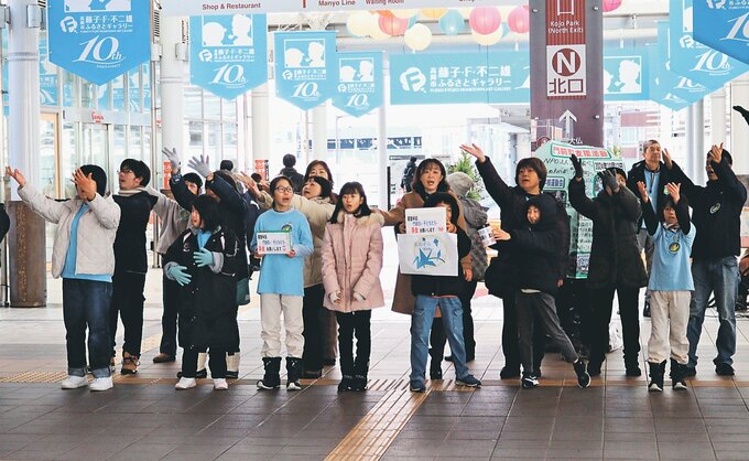能登半島地震の発生から2年となった1日、NPO法人大空へ飛べ(谷口徹理事長)は富山県高岡市の高岡駅の南北自由通路で被災地支援のための募金活動を行った。歌や踊りのパフォーマンスを交え、通行人に協力を呼びかけた。集まった寄付金は6日に谷口理事長らが輪島市の門前中学校などに届ける。
