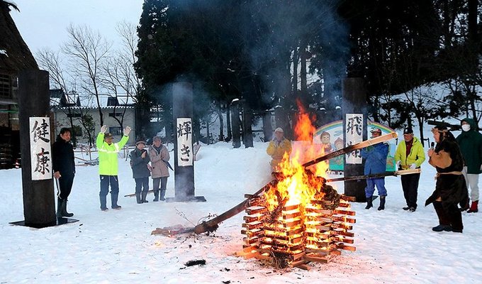 燃やした竹が倒れた方向で今年の運勢を見定める「縄文火占いまつり」が4日、富山県小矢部市の桜町JOMONパークで行われ、「健康」という結果が出た。参加者は健やかに一年を過ごせるよう願っていた。