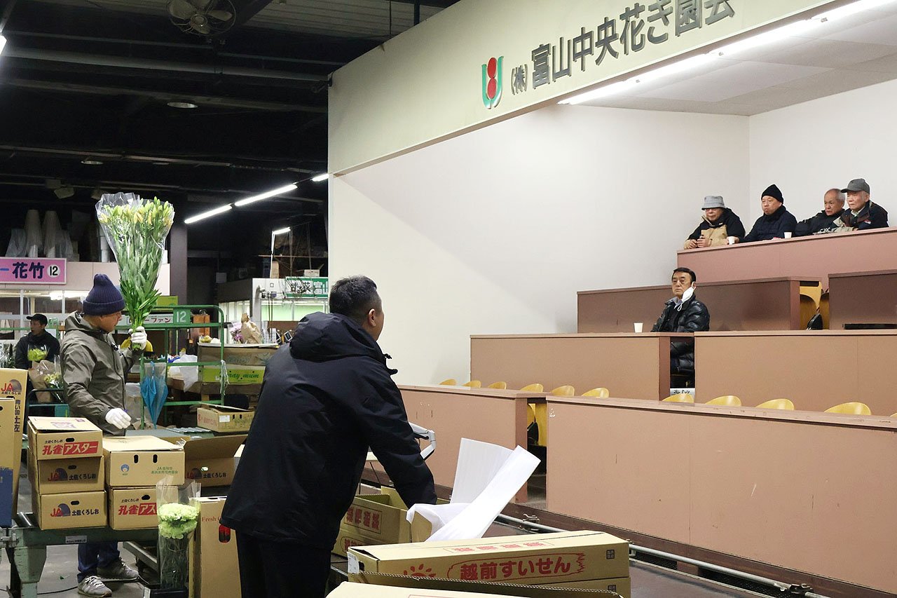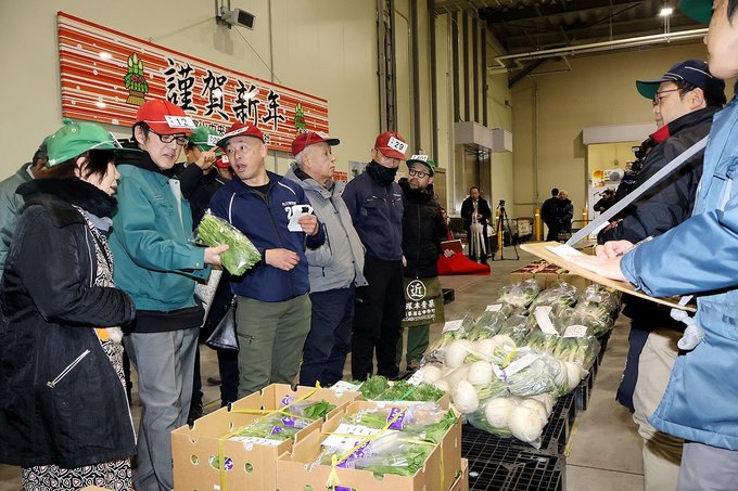 青果部では午前6時ごろに競りが始まり、白ネギやカブ、コマツナ、リンゴなどが並んだ。青果物卸の富山中央青果によると、初日の入荷量は約170トンで、平年並み。気温上昇により、ジャガイモやタマネギは例年より生産量が少なく高値となった。