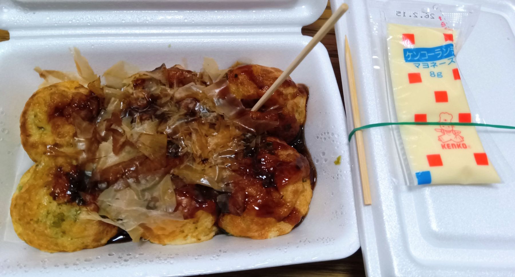 私が買ったのはたこ焼きとソフトクリーム。大きなたこ焼きが6個入りで、マヨネーズは別売り。ソフトクリームも大きくて、100円とは思えません😆(ソフトクリームの写真は撮り忘れました💦)