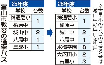 26年度は、水橋地域の7小中学校が合併して誕生する義務教育学校「水橋学園」に8台を配置。浜黒崎小が大広田小に、音川小が古里小にそれぞれ統合され、2校に計3台を新たに導入する。三成小は閉校して水橋学園となる。