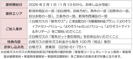 白根ガス株式会社(本社:新潟県燕市、代表取締役社長 小林 裕司、以下「白根ガス」)と東北電力株式会社(本店:宮城県仙台市、代表取締役社長 社長執行役員 石山 一弘、以下「東北電力」)は、2026年2月1日から、新潟県内の一部地域(詳細は下表に記載)にお住まいのお客さまを対象に「白根ガス 東北電力 ガス・でんきセットプラン」(以下「本セットプラン」)を提供することとし、2026年1月13日から先行で申し込み受付を開始いたします。