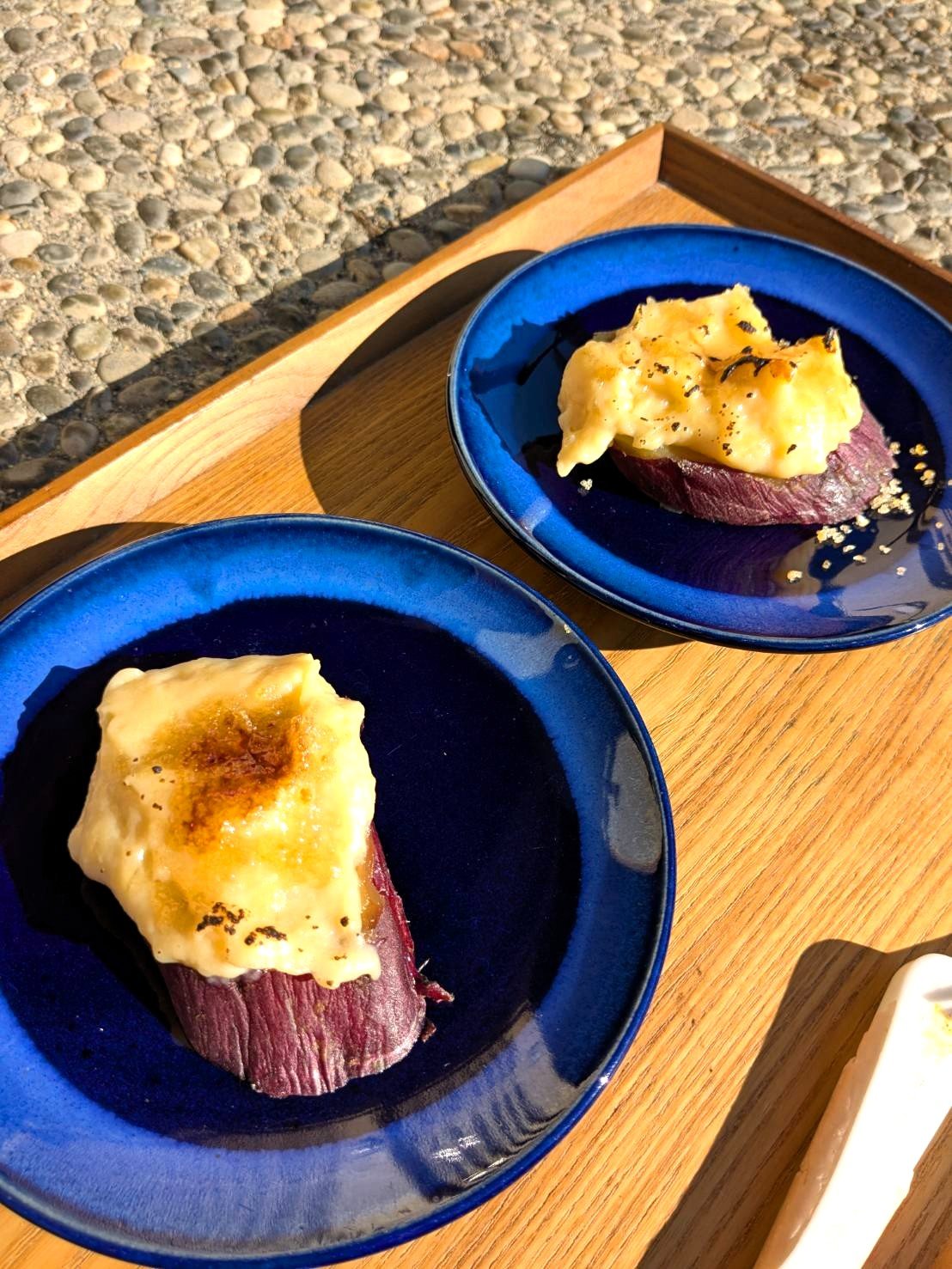 中でも息子たちが好きなのが、ふかし芋の上にカスタードクリームを塗り、ザラメをまぶしてバーナーで焼き上げたクレームブリュレです!