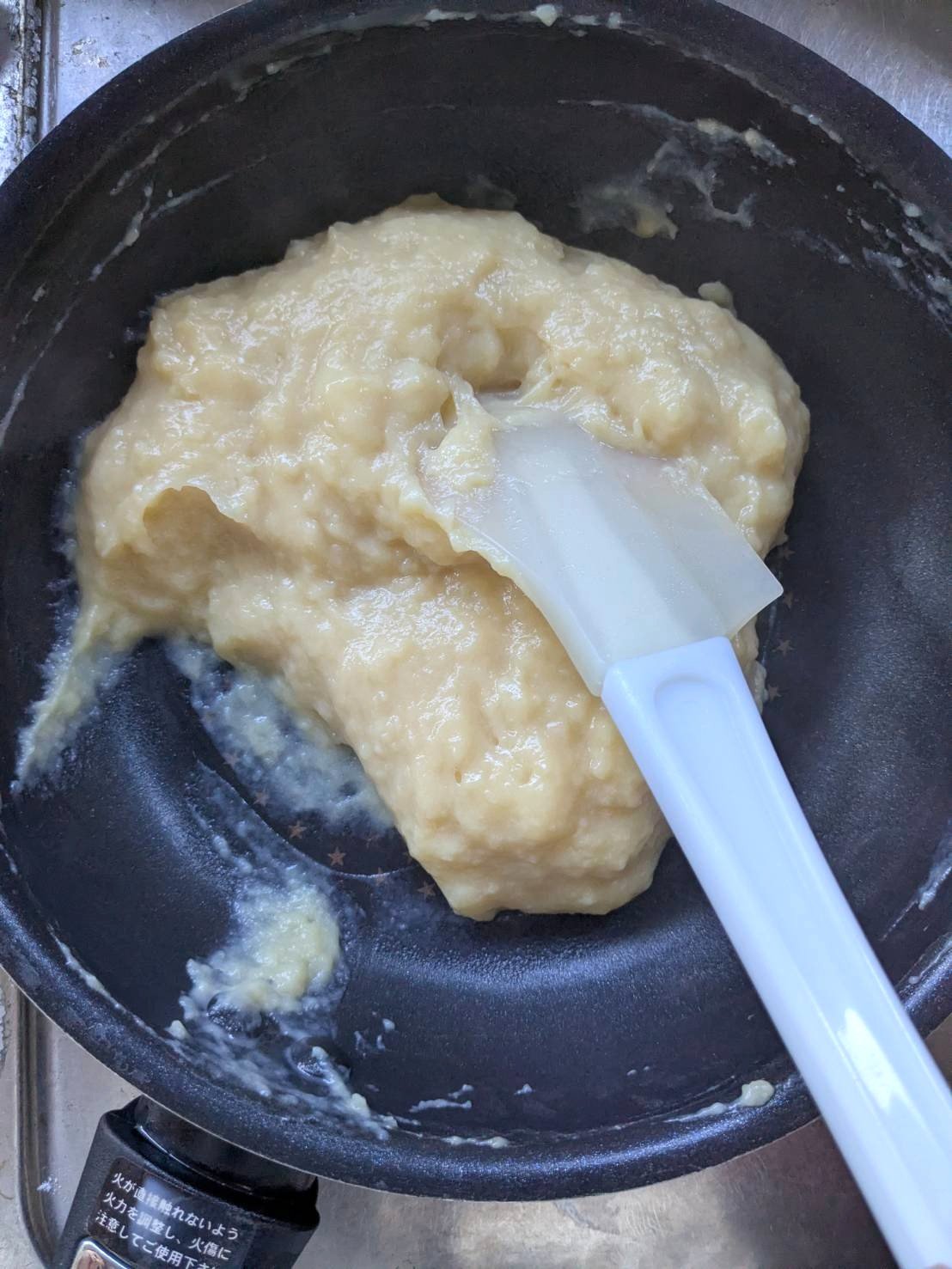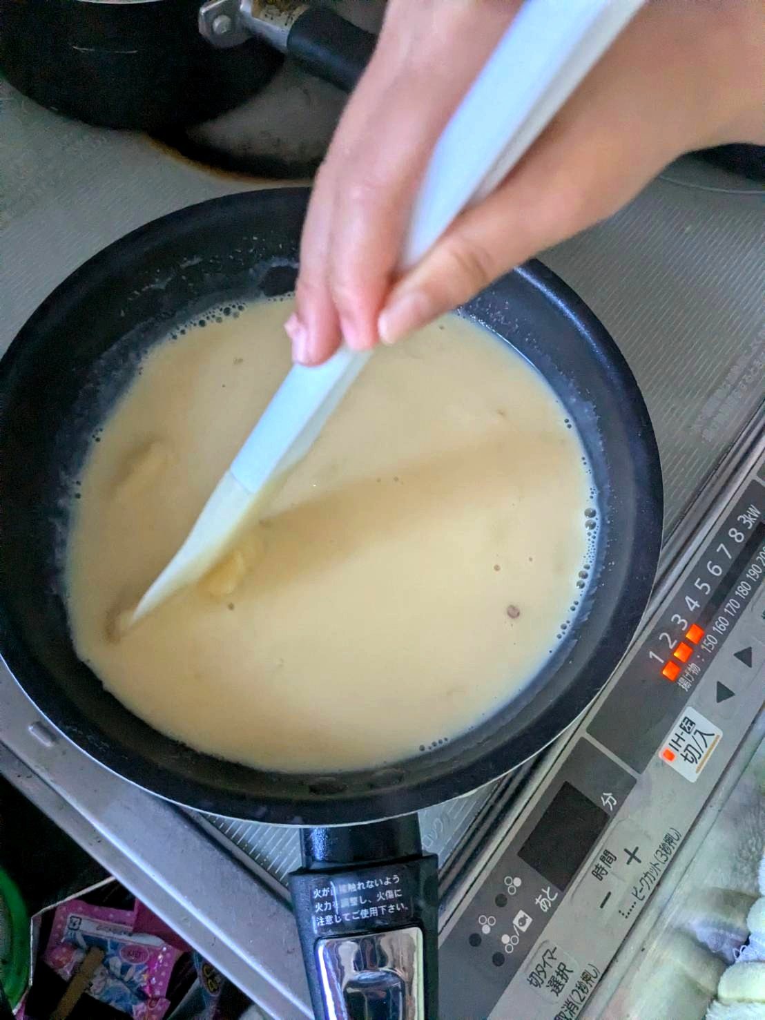 よく混ざったらお鍋に注ぎ入れ、弱火で加熱し、絶えずヘラで混ぜます。混ぜ続けないと焦げる場合があるので、ご注意ください。