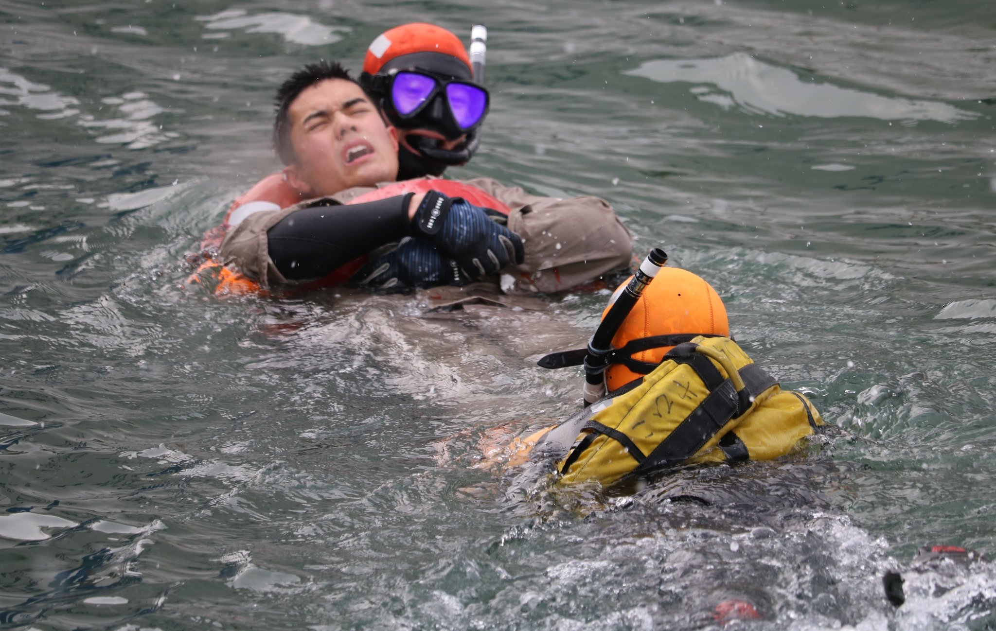 海に転落した人の救助訓練も実施。潜水士2人が真冬の冷たい海に飛び込み、助けを求める男性を抱えながら泳いで、やひこまで運んだ。