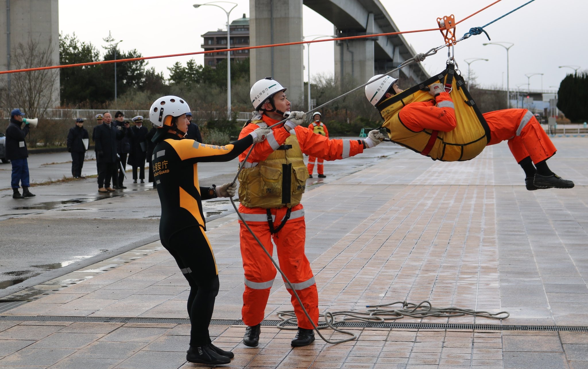 やひこを座礁船に見立て、船内に取り残された人を救出する訓練では、船と岸壁をロープで結び、滑車で要救助者を助け出した。