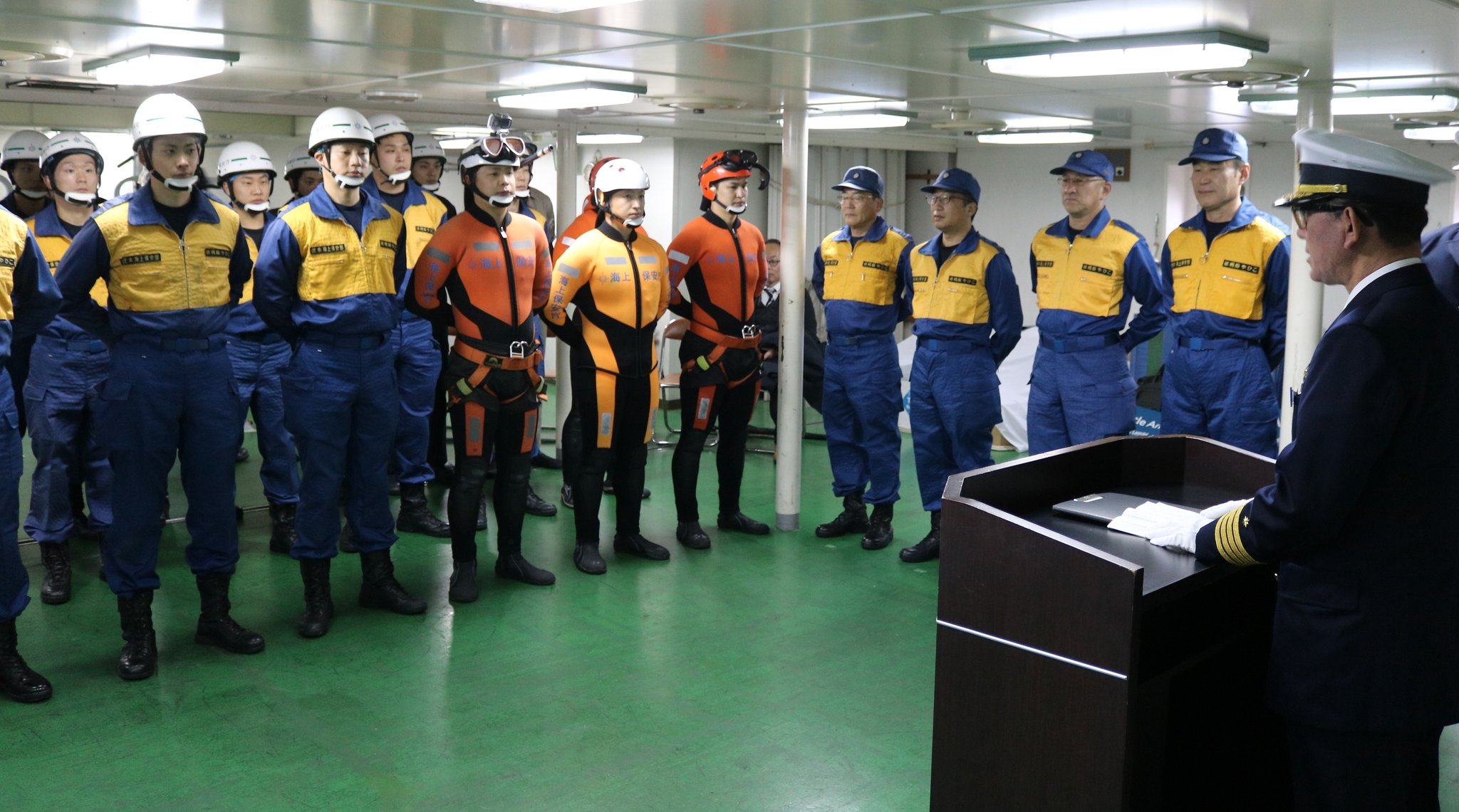 訓練初めは乗組員の士気を高めようと毎年開催。高田英紀部長は開会式の訓示で「富山湾や周辺海域の安心安全に努めてほしい」と呼びかけた。