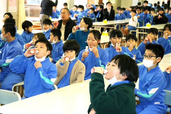 その後、大嶋元輝さん(同)のかけ声に合わせ、全校児童が一斉に飲み干した。