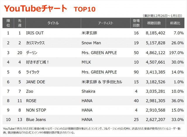2025/12/26-2026/1/1のYouTubeチャートTOP100の週間総視聴回数は前週比10.4%増、TOP100の初登場作は11作(前週7作)となった。