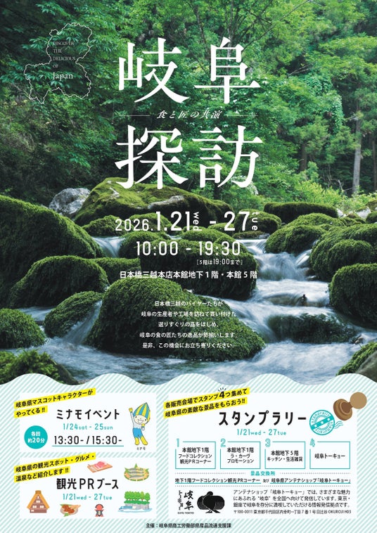 最終開催となる今回は、2026年1月21日(水)~27日(火)、100年以上の歴史を持つ、日本初の百貨店 日本橋三越本店にて開催。「岐阜探訪 ―食と匠の共演― 」をテーマに、老舗百貨店バイヤーの厳しい選択眼にかなった当県自慢の逸品を揃えました。